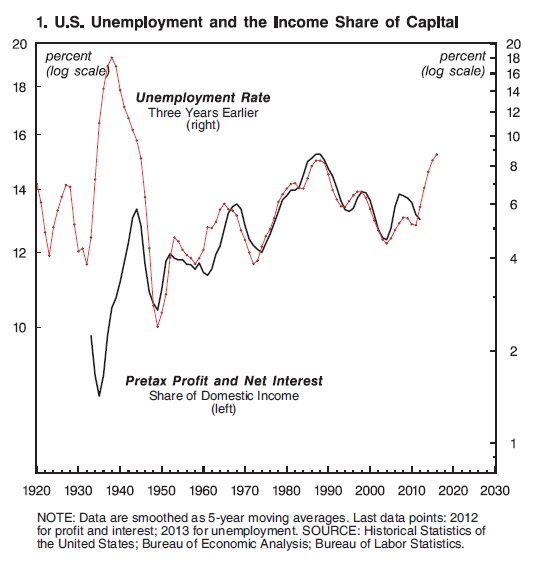 Remarquablement, la corrélation positive montrée dans la figure 1 ne tient pas seulement durant le cycle de court-terme, mais aussi à long terme. Durant l’expansion des années 1940, lorsque le chômage était très faible, les capitalistes s’approprièrent une part relativement faible du revenu domestique. Mais aussitôt que l’expansion faiblit, la croissance décélérait et la stagnation commençait à s’insinuer, la part du capital commença à partir à la hausse. Le pic du pouvoir du capital, mesuré par sa part du revenu global, survint au début des années 1990, lorsque le chômage était à son plus haut d’après-guerre. La globalisation néolibérale qui s’ensuivit apporta un chômage plus faible et une plus petite part pour le capital, mais pas pour longtemps. À la fin des années 2000, la tendance s’est à nouveau renversée, avec le chômage qui s’élève en tandem avec l’augmentation de la part distributive du capital. Regardant l’avenir, les capitalistes ont des raisons de demeurer ravis par la crise : avec des taux de chômage à nouveau proche des sommets d’après-guerre, leur part du revenu a plus de place pour augmenter dans les années à venir.