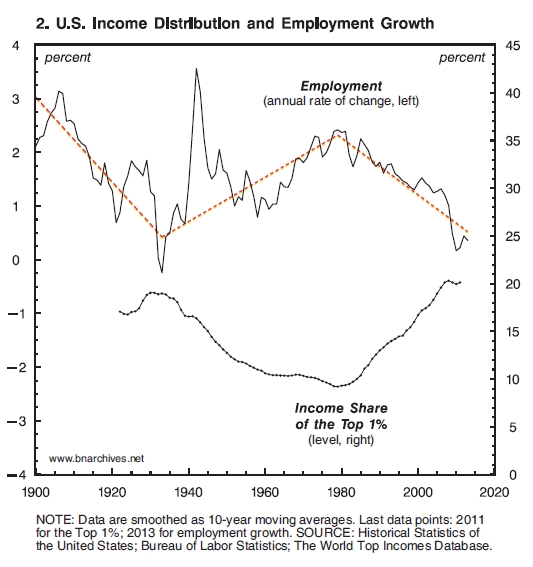Historiquement, cette relation négative peut être divisée en trois périodes distinctes, indiquées par la ligne en pointillée dessinée librement à travers la série de la croissance de l’emploi. La première période est, du tournant du vingtième siècle jusqu’aux années 1930, les dénommées Années Folles [NdT : « Gilded Age » c'est-à-dire Années Dorées]. L’inégalité des revenus s’accroît et la croissance de l’emploi s’effondre.