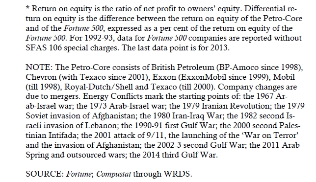 [4] It is important to note here that the energy conflicts have led not to higher oil profits as such, but to higher differential oil profits. For example, in 1969-70, 1975, 1980-82, 1985, 1991, 2001‑2, 2006-7, 2009 and 2012, the rate of return on equity of the Petro‑Core actually fell; but in all cases the fall was either slower than that of the Fortune 500 or too small to close the positive gap between them, so despite the decline, the Petro‑Core continued to beat the average.