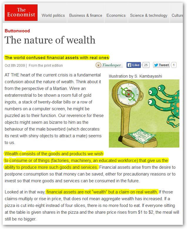 This ‘mismatch thesis’ – the notion of a reality distorted by finance – is broadly accepted. In 2009, The Economist of London accused its readers of confusing ‘financial assets with real ones’, singling out their confusion as the root cause of the brewing crisis (Figure 1). Real assets, or wealth, the magazine explained, consist of ‘goods and products we wish to consume’ or of ‘things that give us the ability to produce more of what we want to consume’. Financial assets, by contrast, are not wealth; they are simply ‘claims on real wealth’. To confuse the inflation of latter for the expansion of the former is the surest recipe for disaster.