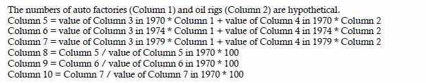 According to Table 2, in 1974 the price of automobile factories was $300 million apiece – 50 per cent higher than in 1970 – and the price of oil rigs was 200 per cent higher, at $300 million. Now, if we take these as our PCE prices and therefore as revealing the true util-generating capacity of the underlying assets, the quantity of capital would be very different than in the first scenario. Unlike before, the price ratio now is not 2:1, but 1:1, and that difference changes everything. The new results are shown in Column 6.
