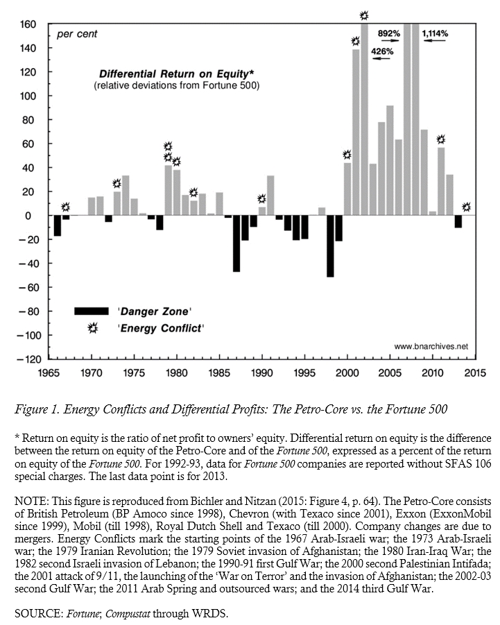 During the late 1980s, we printed a series of working papers, offering a new approach to the political economy of Israel and wars in the Middle East. [2] Our approach in these papers rested on three new concepts. It started by identifying the Weapondollar-Petrodollar Coalition – an alliance of armament firms, oil companies and financial institutions based mostly in the United States – whose interests, we posited, converged in the Middle East. [3] It continued by arguing that the interests of this coalition were best measured by its differential accumulation – i.e., by its performance relative to other large firms. And it concluded by showing that variations in differential accumulation predicted subsequent Middle East energy conflicts (our term).