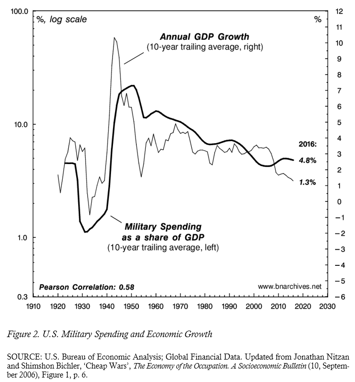 The data show the close co-movement of the two series (Pearson correlation coefficient of +0.58). After the First World War, disarmament went hand in hand with falling growth – but this situation proved temporary. In the 1930s, the tide inverted: military spending soared in preparation for the Second World War and the economy boomed. After the war, when demobilization coincided with a sharp drop in growth, the U.S. National Security Council suggested that, looking forward, the government consider keeping military expenditures permanently high as a way of avoiding another depression (United States 1950). The subsequent adoption of Military Keynesianism, along with the wars in Korea and Vietnam, helped achieve that goal. During the 1960s, 1970s and 1980s, military expenditures remained over 10 percent of GDP and economic growth above 4 percent – lower than during the Second World War, but rapid enough to sustain the buoyancy of American capitalism and the confidence of its capitalists. By the early 1990s, though, the Cold War had ended, and with neoliberal ‘peace dividends’ undermining military budgets, economic growth decelerated sharply: in the decade ending in 2016, growth fell to a mere 1.3 percent, a level last seen in the 1930s.