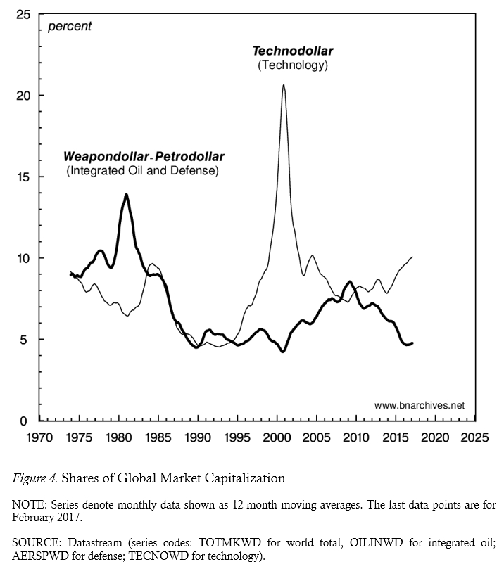 Is there a similar intra-class conflict affecting the ebb and flow of Middle East wars? To contextualize this question, consider Figure 4, which juxtaposes two global coalitions: the Weapondollar-Petrodollar cluster, made up of listed integrated oil and defense corporations, and the Technodollar Coalition, comprising listed technology firms, both hardware and software. Each series measures the market capitalization of the relevant coalition, expressed as a percent share of the global market capitalization of all listed firms. [12]