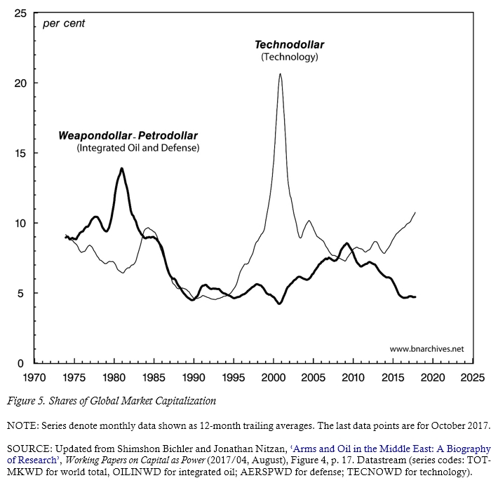 Is there a similar intra-class conflict affecting the ebb and flow of Middle East wars? To contextualize this question, consider Figure 5, where we juxtapose two global coalitions: the Weapondollar-Petrodollar cluster, made up of listed integrated oil and defence corporations, and the Technodollar Coalition, comprising listed technology firms, both hardware and software. Each series measures the market capitalization of the relevant coalition, expressed as a per cent share of the global market capitalization of all listed firms.