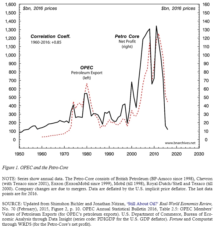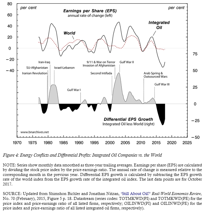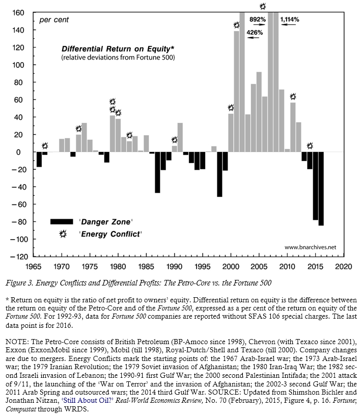 Beginning in the late 1980s, we suggested that, since the late 1960s, the Middle East was greatly influenced by the capitalized power of a Weapondollar-Petrodollar Coalition – a loose coalition comprising the leading oil companies, the OPEC cartel, armament contractors, engineering firms and large financial institutions – whose differential accumulation benefitted from and in turn helped fuel and sustain Middle East ‘energy conflicts’. These conflicts, we argued, reverberated far beyond the region: they affected the ups and downs of global growth, the gyrations of inflation and, in some important respects, the very evolution of the capitalist mode of power. And this impact, it seems to us, is now being called into question.