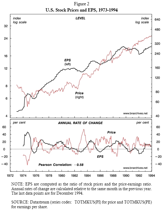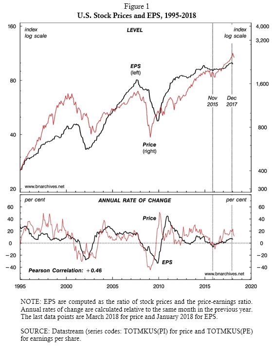 Judging by Figure 1, the main driver of U.S. stock prices is current earnings per share, or EPS. [2] The chart contrasts monthly data for EPS and share prices since 1995. The top panel plots the levels of the two variables, while the bottom panel shows their annual rates of change, and in both cases the temporal pattern leaves little doubt: share prices and current earnings are tightly correlated.