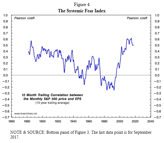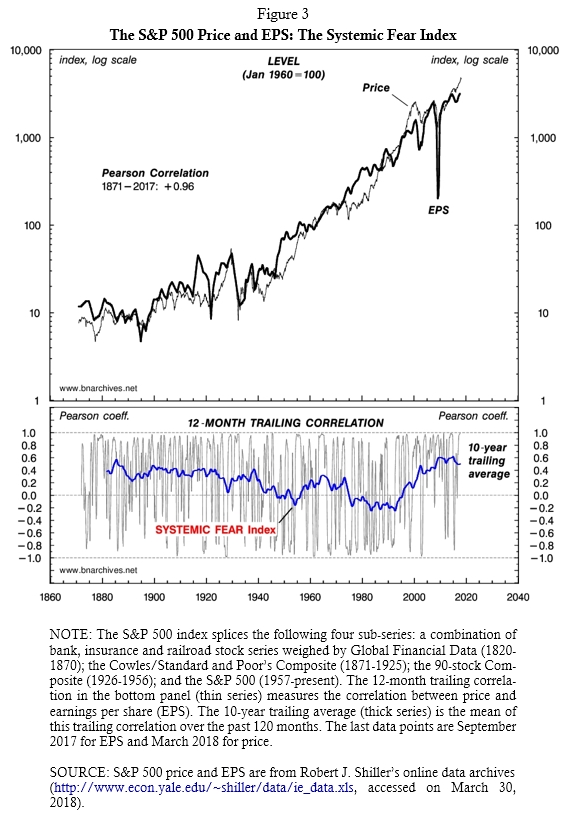 The difficulty with the thin 12-month trailing correlation is that it oscillates widely, so visual inspection alone is not very revealing here. The thick series in the bottom panel addresses this difficulty by smoothing the thin series as a ten-year trailing average. Each observation in the thick series measures the average 12-month trailing correlation between price and EPS over the previous ten years. [7] We call this series the systemic fear index.