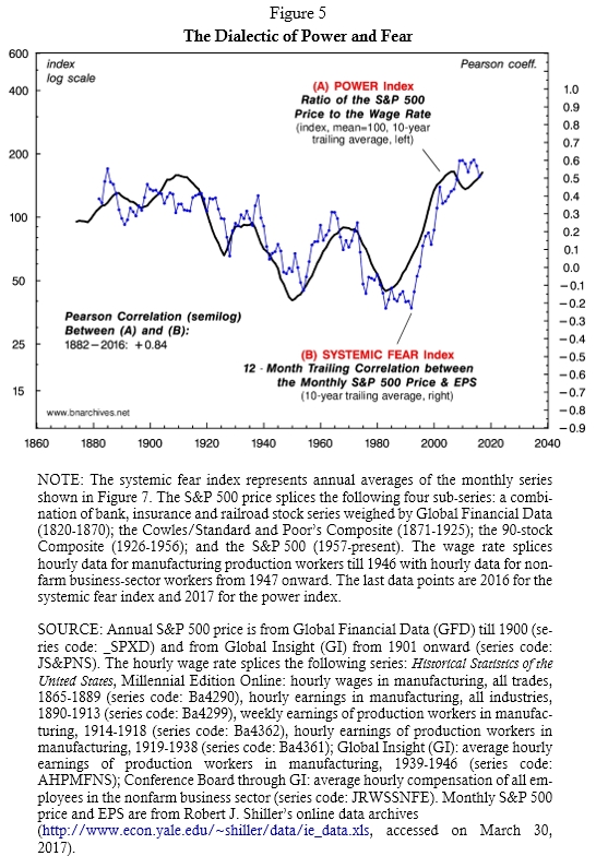 Now, as Figure 5 indicates – and here we come to the crucial point – our power and systemic fear indices seem to move in tandem. The dotted blue series, plotted against the right scale, is our systemic fear index, taken from Figure 4 (to reiterate, this index is the ten-year trailing average of the 12-month trailing correlation between the S&P 500 price and EPS). The solid black series, plotted against the left log scale, is our power index, smoothed as a ten-year trailing average to match the periodicity of the systemic fear index. And as the data show, the correlation between them is very tight: its Pearson coefficient for the past 134 years is +0.84 out of a maximum of +1.