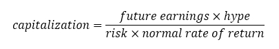 In our earlier work (Bichler and Nitzan 2006; Nitzan and Bichler 2009: Ch. 11), we developed the notion of the ‘elementary particles’ of capitalization – future earnings and investors’ hype in the numerator of the capitalization formula, and risk and the normal rate of return in the denominator: