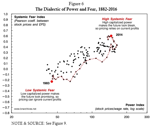 But as Figure 5 shows, there is another, inner process at work here: the temporal basis for capitalist confidence in obedience varies with the level of capitalized power. When the power index is low, the projected confidence of capitalists is inherently forward-looking. During such periods – for example, the 1940s or the 1980s – capitalists focus on the future and ignore present profits altogether (as indicated by the low, zero or even negative price-EPS correlation). And why? Because the lower the capitalized power, the greater the scope for increasing it further.