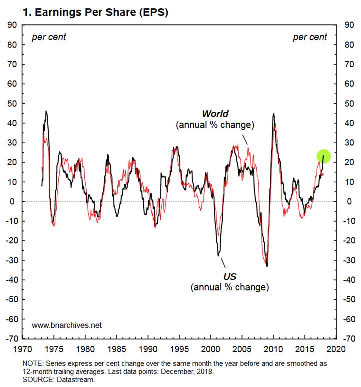According to the data, current EPS growth rates hover around their upper historical bound: the U.S. rate is just shy of +25% (circled in green), while the global rate (including the U.S.) is already down from its +20% peak.