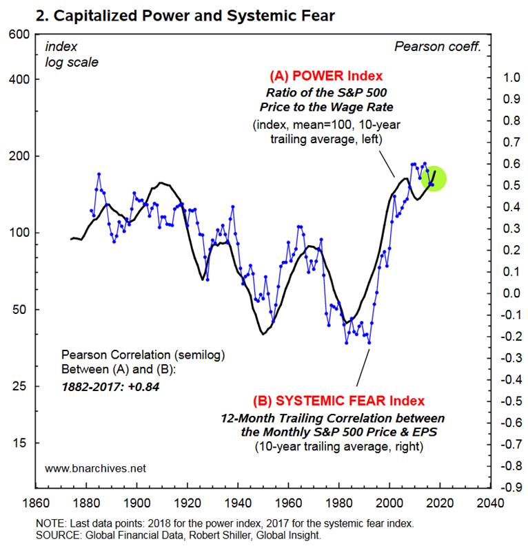 Now why did our ‘systemic fear index’ decline during much of the twentieth century, only to reverse course and rise sharply since the 1990s? The answer, we suggest, has to do with the solid black series shown in Figure 2. This series measures the ratio between the S&P 500 price index and the U.S. average wage rate, and we label it the power index.