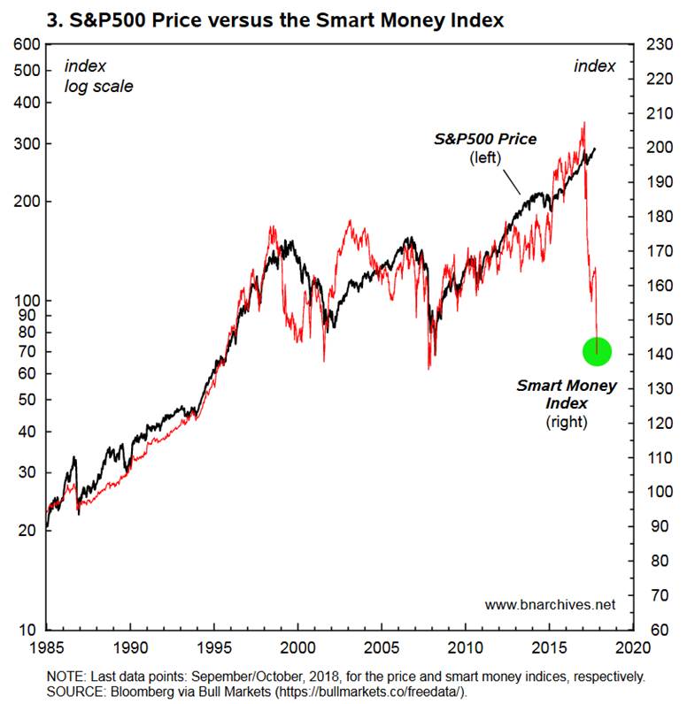 Based on this arithmetic, the huge drop in the smart money index since early 2018 against the backdrop of a rising S&P 500 price suggests that sophisticated investors have grown extremely pessimistic.