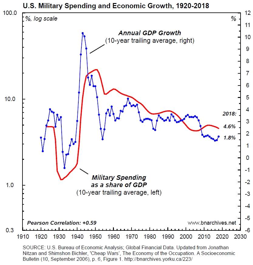 Now, if the correlation shown in the chart isn’t spurious – in other words, if higher U.S. growth indeed depends on a larger share of the country’s GDP going to the military – America’s growth prospects look dim.