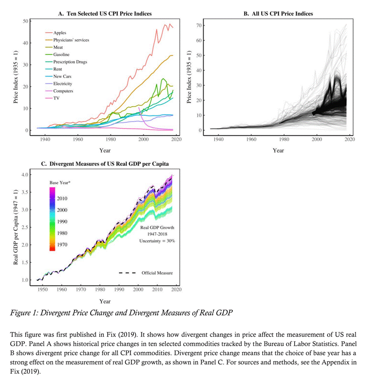 In a recent paper, Blair Fix (2019) estimates the uncertainty in real GDP resulting from the base-year problem. To reiterate, this uncertainty is caused by instability in relative prices. Over the long term, this instability is spectacular. Figure 1A shows the divergent price change of 10 selected commodities from the US Consumer Price Index. Figure 1B shows the price change of all CPI commodities. Figure 1C shows the resulting uncertainty in real GDP growth – about 30 per cent since 1947. [2]