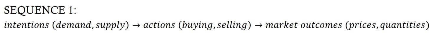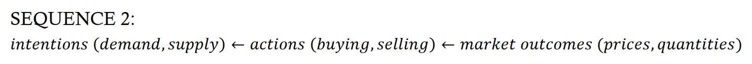 To flesh out the circularity, recall that, in their textbooks, mainstream economists argue that the intentions-read-desires of buyers and sellers (demand and supply) explain their actions (buying and selling), and that these actions in turn drive market outcomes (prices and quantities). This process is shown in Sequence 1: