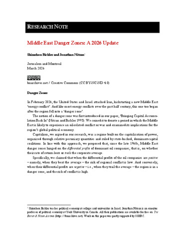 Capitalism, we argued in our research, was a regime built on the capitalization of power, organized through relative pecuniary quantities and ruled by state-backed, dominant-capital coalitions. In line with this approach, we proposed that, since the late 1960s, Middle East danger zones hinged on the differential profits of dominant oil companies; that is, on whether their rate of return beats or trails the corporate average.